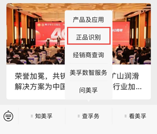 美孚™ 工业油官方微信公众号菜单栏「正品识别」点击进入