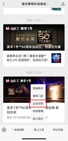 1. 美孚™乘用车润滑官方微信公众号菜单栏「正品识别」点击进入“Mobil™美孚™防伪综合平台”欢迎页